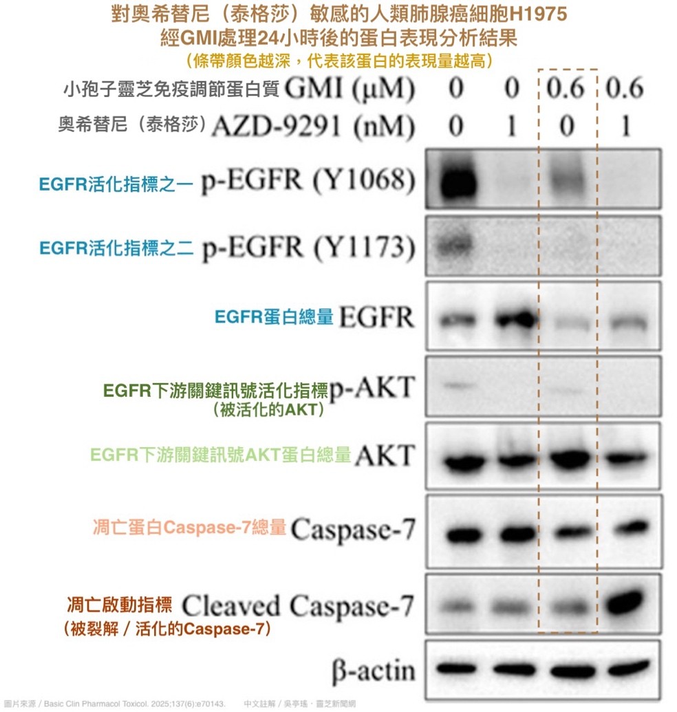 根據2025年底發表在北歐藥理學與毒理學協會官方刋物《基礎與臨床藥理學與毒理學》(Basic & Clinical Pharmacology & Toxicology) 的研究顯示,不論EGFR雙突變的肺腺癌細胞是否已經對奧希替尼產生抗藥性,GMI都能透過「促凋亡」和「促自噬」雙重手段,大幅降低癌細胞的存活與增殖能力。