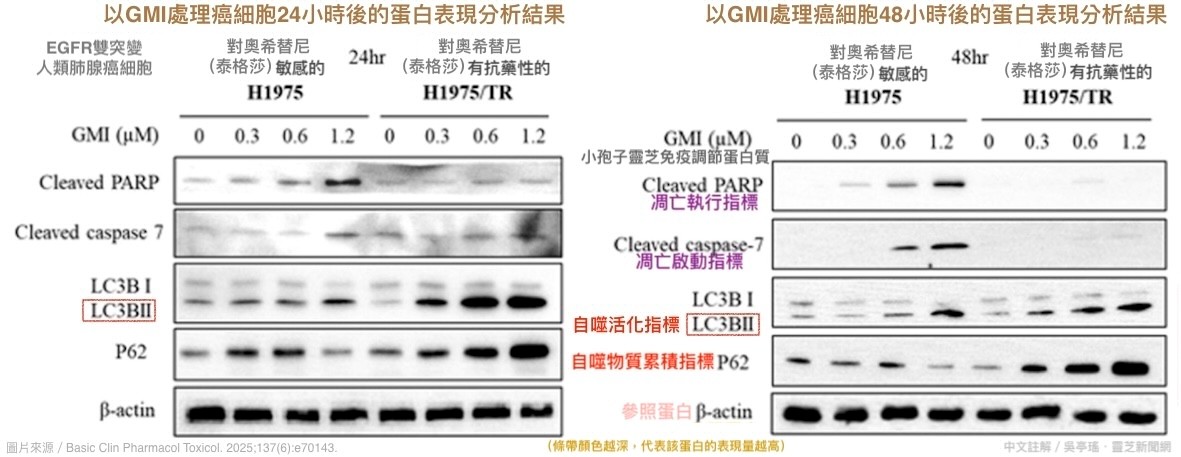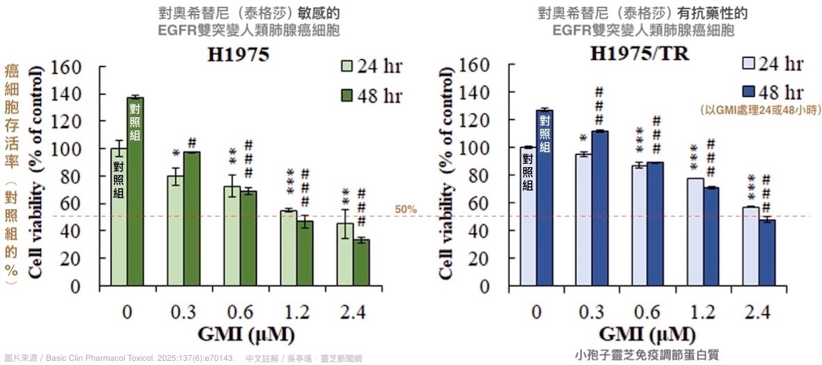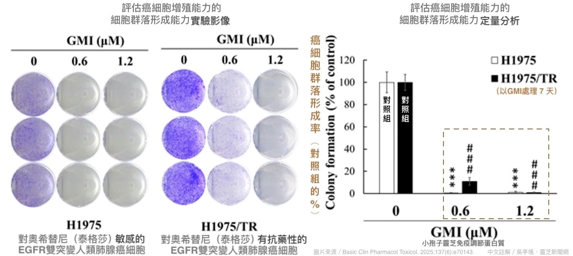 根據2025年底發表在北歐藥理學與毒理學協會官方刋物《基礎與臨床藥理學與毒理學》(Basic & Clinical Pharmacology & Toxicology) 的研究顯示,不論EGFR雙突變的肺腺癌細胞是否已經對奧希替尼產生抗藥性,GMI都能透過「促凋亡」和「促自噬」雙重手段,大幅降低癌細胞的存活與增殖能力。