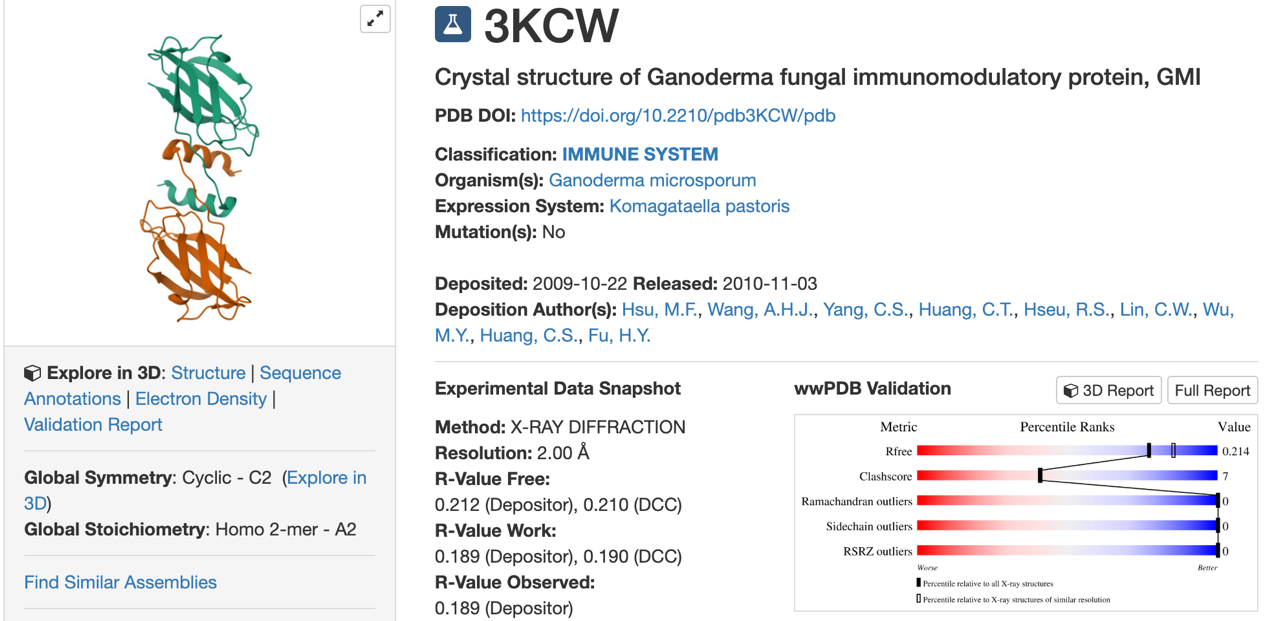 ④ 源自小孢子靈芝(Ganoderma microsporum)的GMI是一個化學結構清楚且可被規模化量產的純蛋白質,其在蛋白質資料庫Protein Data Bank(PDB ID: 3KCW) 和美國衛生研究院的化學分子與生物活性資料庫PubChem(SID:461501955)均登記有案。